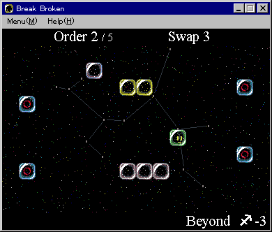 Break Broken ver 1.00 (99.07/22) 49.0KB VB5 ■ 宇宙をバックにして、配置された「石」を破壊していく。ルールに癖があり、かなり高難度なパズルゲーム。全50面。 |