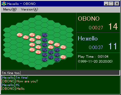 Hexello ver 1.00 (99.11/20) 43.8KB VB5 ■ ネットワークを介して対戦する六角マスのリバーシ。チャット機能付き。 |