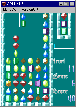COLUMNS ver 1.01 (00.07/23) 86.1KB VB5 ■ 上から落ちてくる宝石を三つ並べて消していく。単純にして奥が深いアクションパズルゲーム。 |